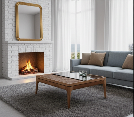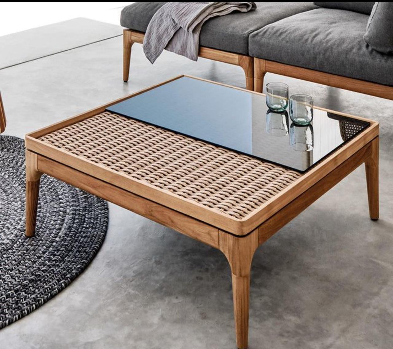 Rubber teak with Natural rattan in natural polish. Black tinted 6mm toughen glass.
