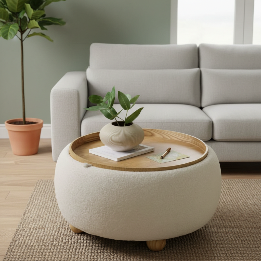 Fabric Finish: Soft beige boucle upholstery offering a luxurious tactile feel.