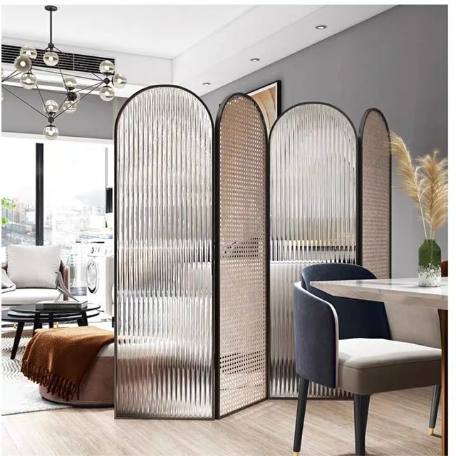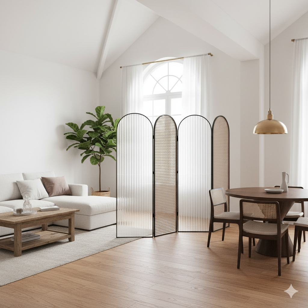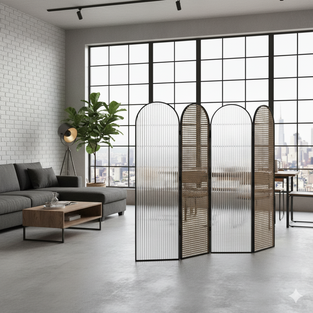 Panels: Combination of Ribbed fluted acrylic glass panels for semi-privacy and a modern translucent effect