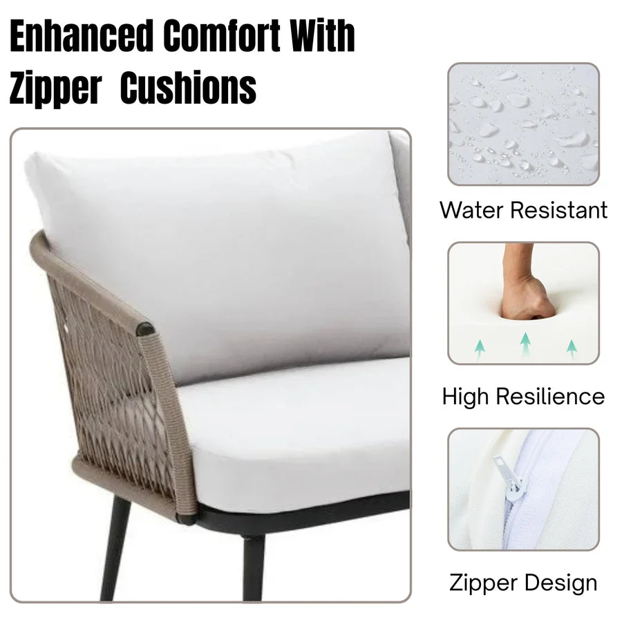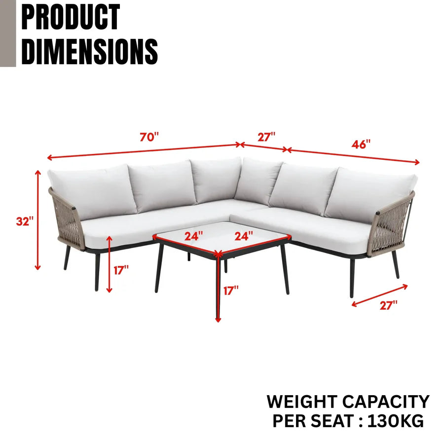 Transform your outdoor living area into a stylish and inviting retreat with this premium L-shape outdoor rope sofa set, thoughtfully designed for use in gardens, decks, lawns, and poolside patios. Blending contemporary aesthetics with durable functionality, this set is crafted to elevate both comfort and outdoor elegance.