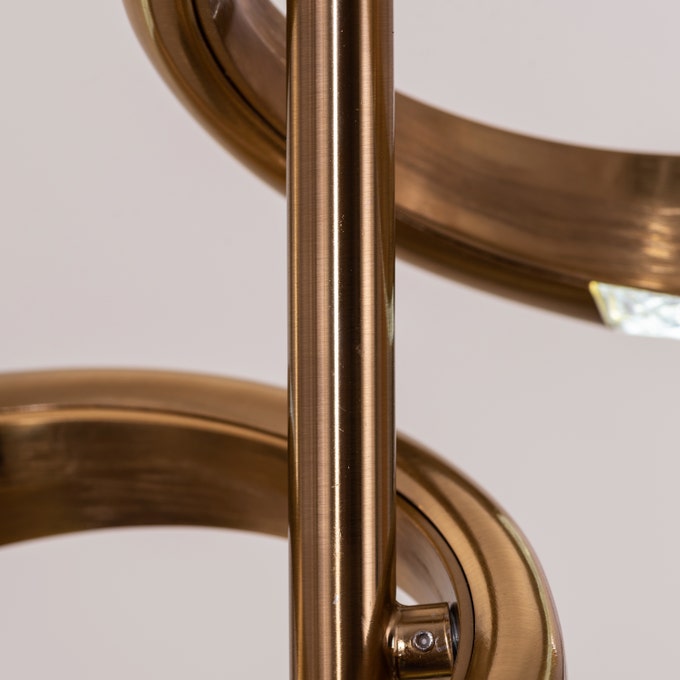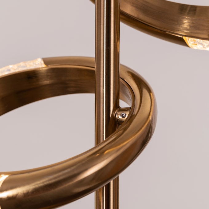 Two rings of matte gold are fitted with textured acrylic diffusers and placed on a sleek metal frame in matte gold. This table lamp creates a scintillating light in the space it adorns. It comes with built-in LED lights that are dimmable using a remote control unit that comes with this stunner. A glamorous combination of gold and crystal-like acrylic, this is an absolute must-have table lamp for bedrooms, living rooms, lounges, and more