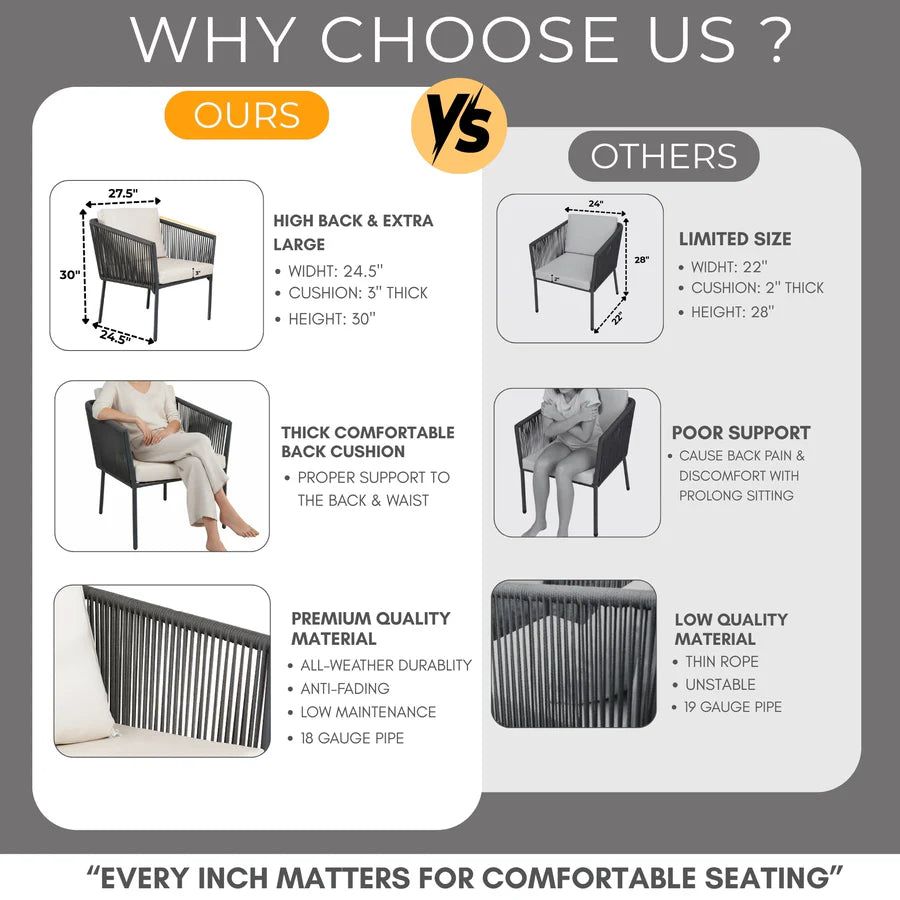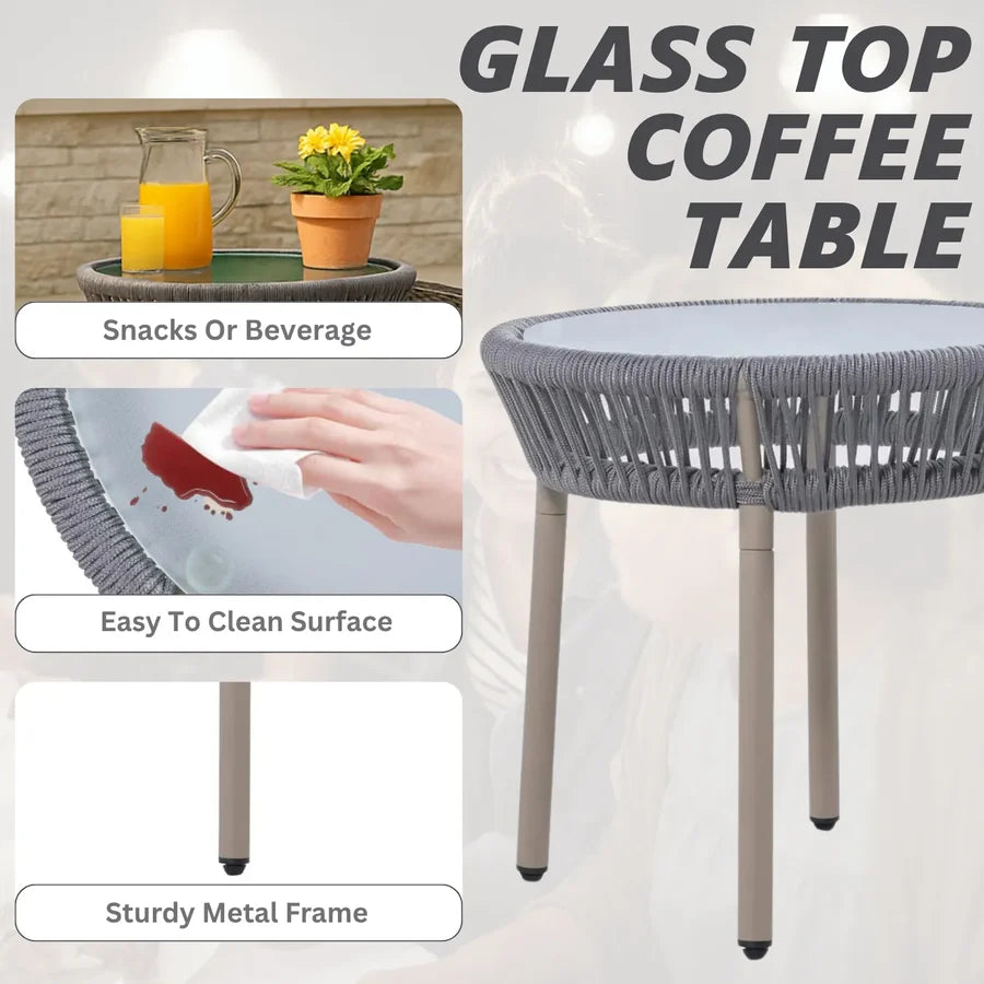 Upgrade your outdoor living experience with this stylish 3 Piece Patio Rope Set, thoughtfully designed to bring modern elegance, comfort, and functionality to your balcony, garden, or patio. Featuring two ergonomically designed cushioned chairs and a sleek glass-top table, this set is the perfect blend of style and relaxation for morning coffees, evening chats, or weekend lounging.