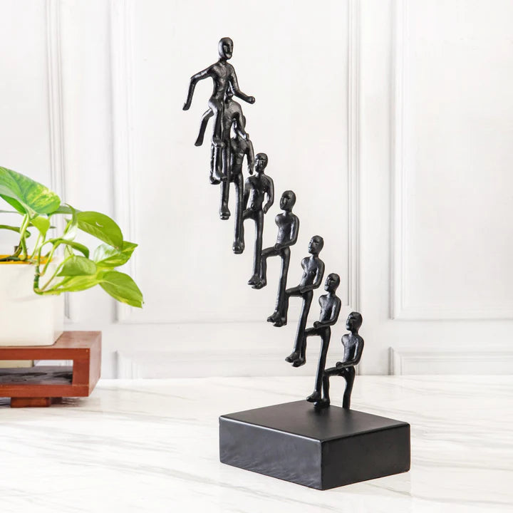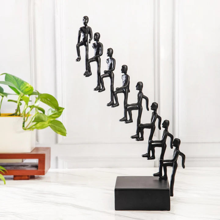Explore an exquisite home decor designer's art sculpture made from metal, depicting 8 men engaged in a climbing endeavor. This exclusive, handcrafted piece exudes an aura of success and achievement, bringing a distinctive charm to any space. With its imported origin and limited availability, this sculpture stands out as a true masterpiece. Whether enhancing a personal art collection, it leaves a lasting impression on admirers. Embrace the uniqueness and elegance of this carefully crafted creation, elevating the ambiance of your surroundings and sparking conversations about the beauty of artistic expression.