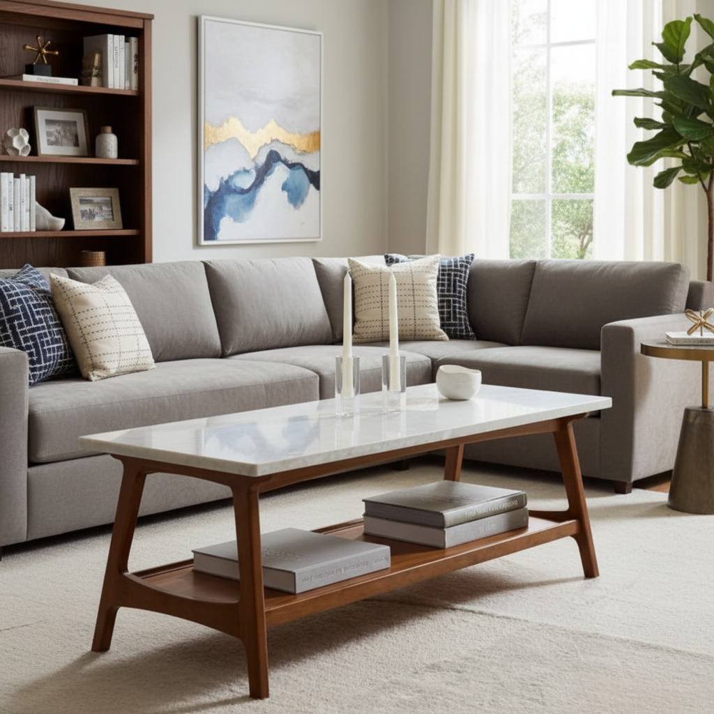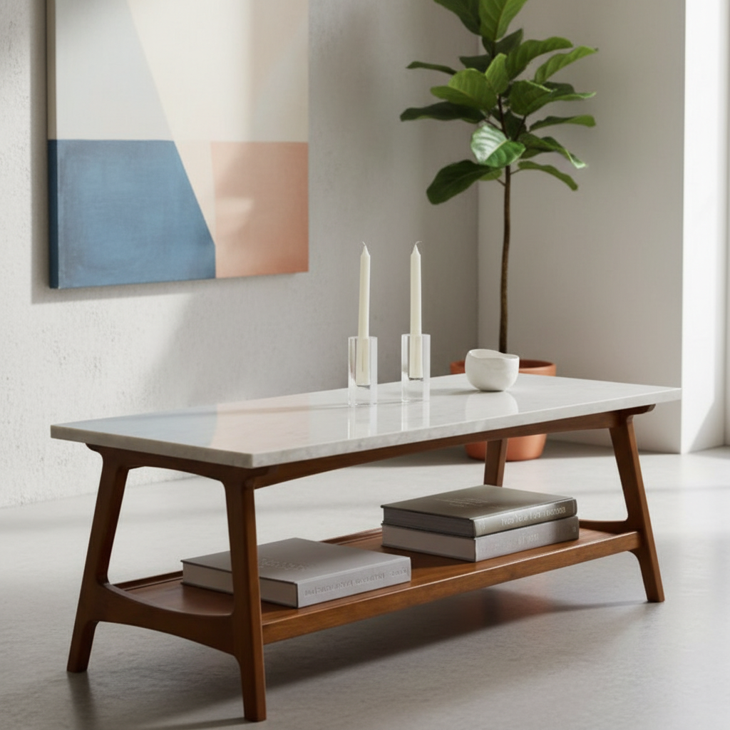 Tabletop: Premium full body tile (10–12 mm thick), precision-fitted on a teak wood base for a sleek, durable surface finish.