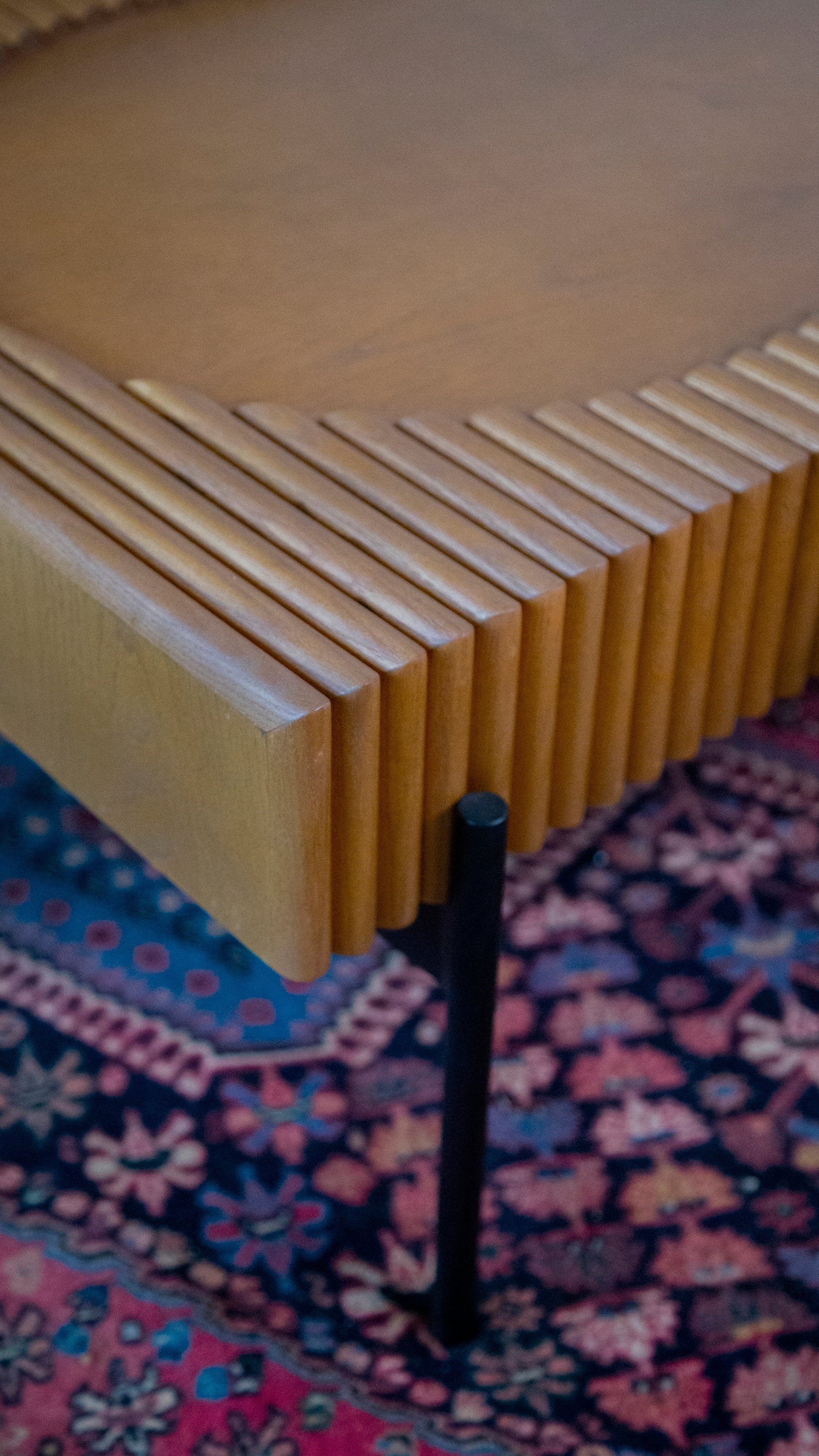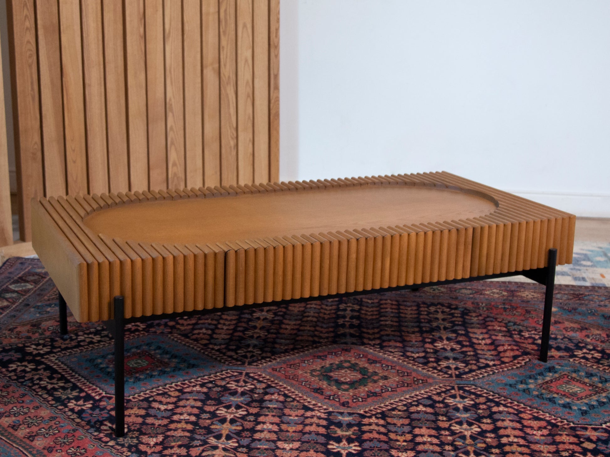 The treble coffee table is inspired by musical notations, a positive of a negative. Denoting a treble to a bass, this piece marks a circle within a square to create an island of it's own. Made out of solid white ash wood in a natural stain finish and a metal base, the wooden fluting detail adds to the glamour of this unique piece in your living rooms.