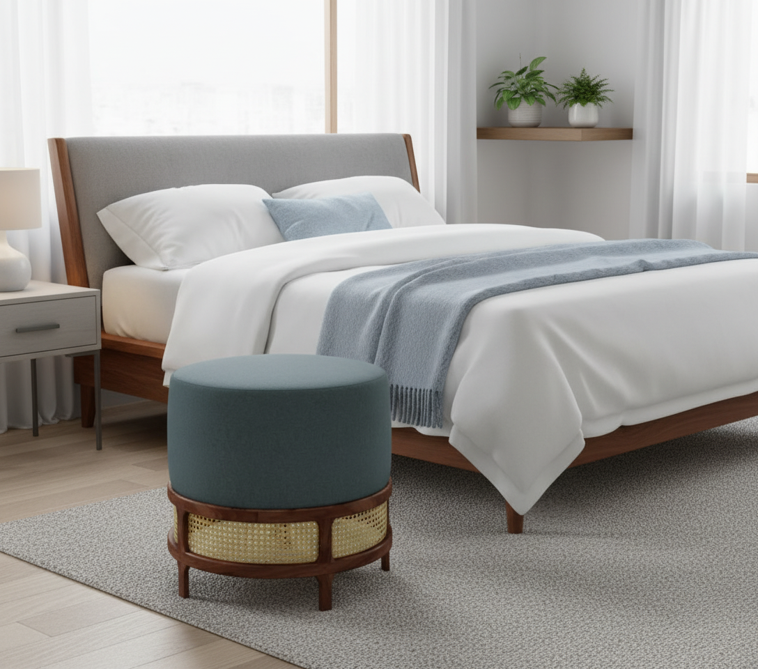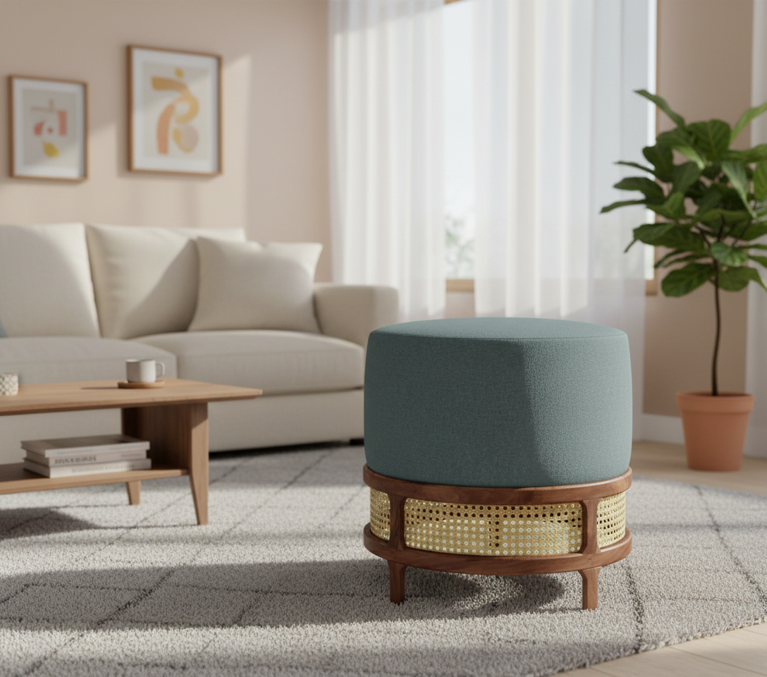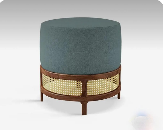 Rubber wood finish with natural polish. Natural rattan . 8" High-Density Foam (40–45 density works well for comfort + durability) with jute look soft fabric.